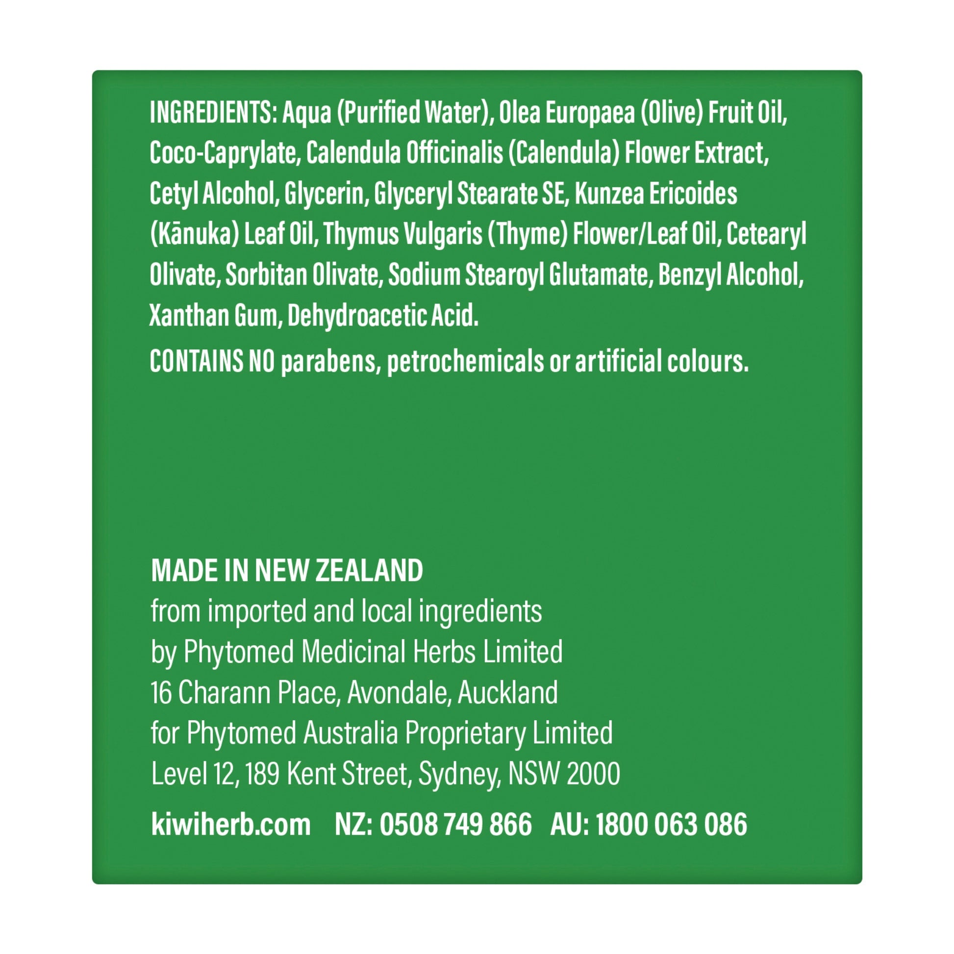 | Aqua (Purified Water), Olea Europaea (Olive) Fruit Oil, Coco-Caprylate, Calendula Officinalis (Calendula) Flower Extract, Cetyl Alcohol, Glycerine, Glyceryl Stearate SE, Kunzea Ericoides (Kānuka) Leaf Oil, Thymus Vulgaris (Thyme) Flower/Leaf Oil, Cetearyl Olivate, Sorbitan Olivate, Sodium Stearoyl Glutamate, Benzyl Alcohol, Xanthan Gum, Dehydroacetic Acid. |