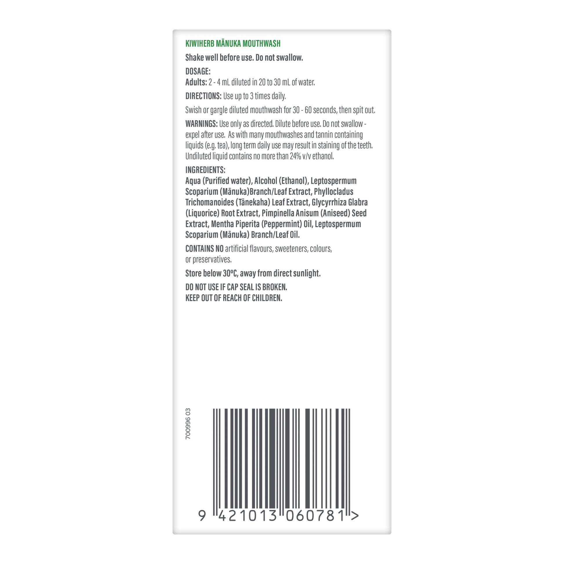 | Aqua (Purified Water), Alcohol (Ethanol), Leptospermum Scoparium (Mānuka) Branch/Leaf Extract, Phyllocladus Trichomanoides (Tānekaha) Leaf Extract, Glycyrrhiza Glabra (Liquorice) Root Extract, Pimpinella Anisum (Aniseed) Seed Extract, Mentha Piperita (Peppermint) Oil, Leptospermum Scoparium (Mānuka) Branch/Leaf Oil. |
