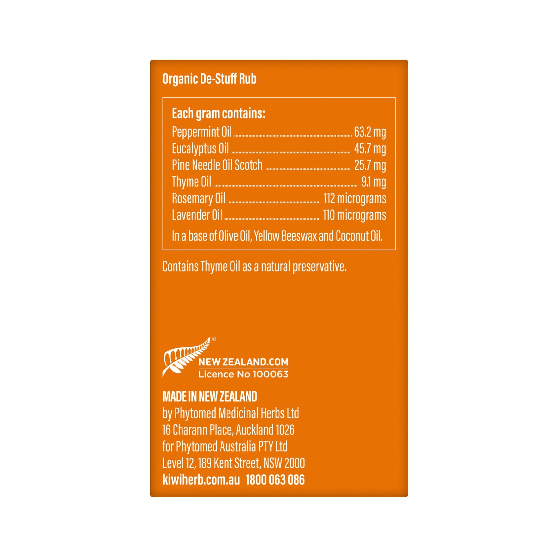 Organic De-Stuff Rub is specifically formulated for children aged 2 years and older. Containing active plant extracts in a soothing aromatic rub, that is a gentle yet effective blend of six essential oils in a moisturising base of cold pressed Coconut Oil, Olive Oil and New Zealand Beeswax.