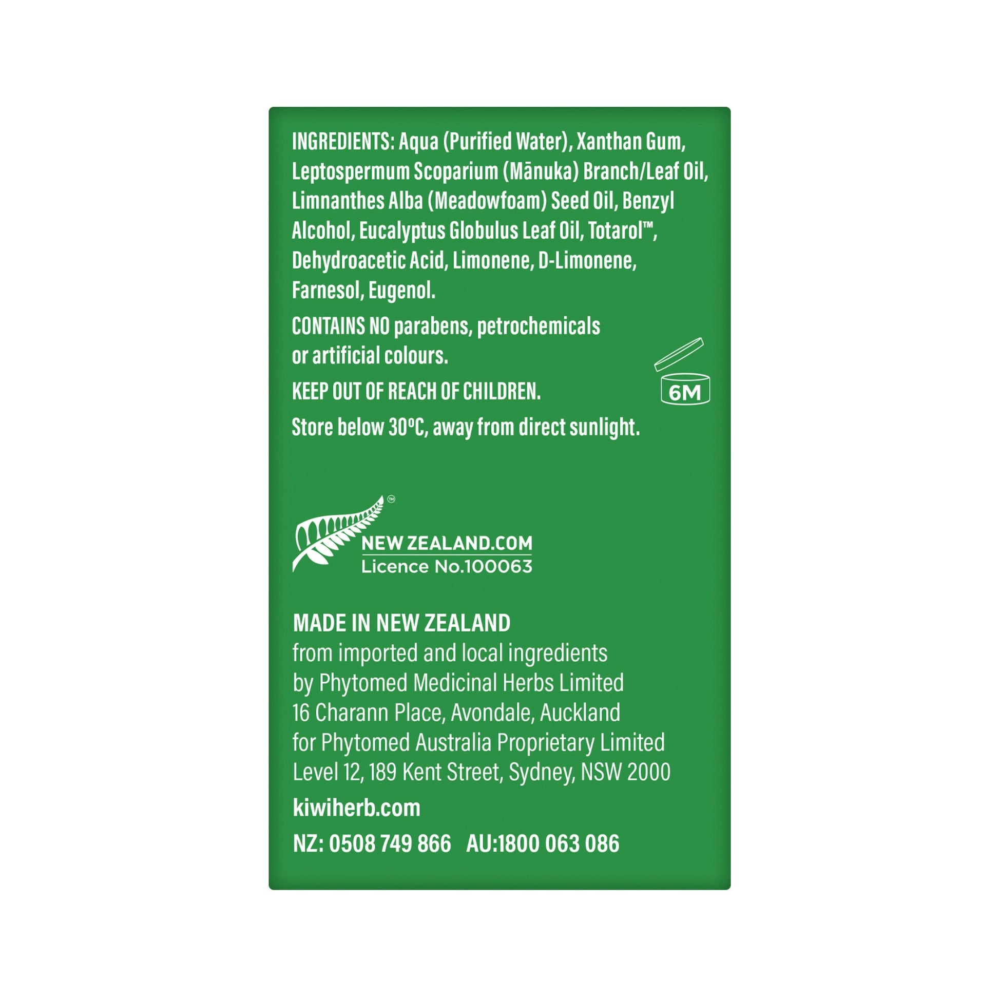 | Aqua (Purified Water), Xanthan Gum, Leptospermum Scoparium (Mānuka) Branch/ Leaf Oil, Limnanthes Alba (Meadowfoam) Seed Oil, Benzyl Alcohol, Eucalyptus Globulus Leaf Oil, Totarol™, Dehydroacetic Acid, Limonene, Farnesol, Linalool, Eugenol. |